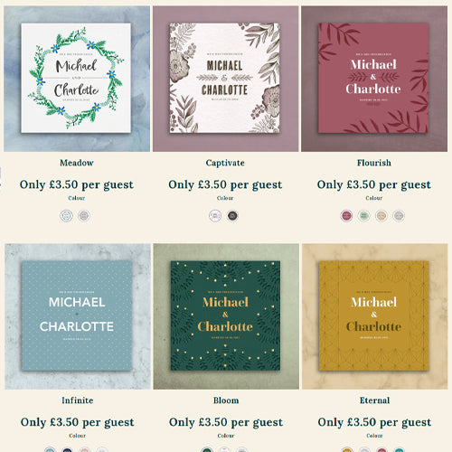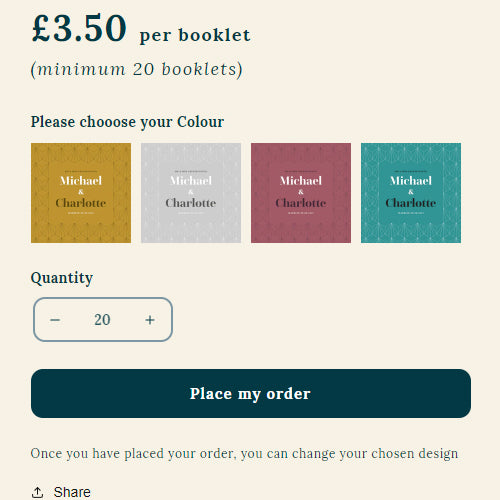 Select the colour booklet you would like, along with the number of booklets required. We recommend one per guest.