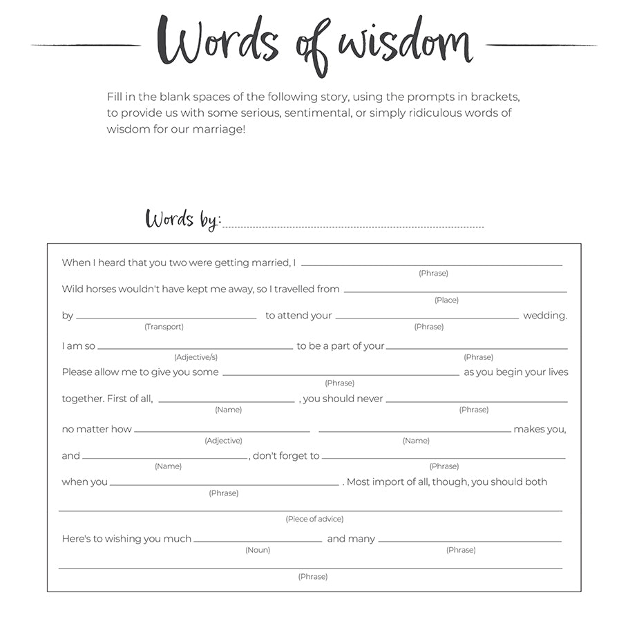 Also known as mad libs, this improvising little activity gives your guests a piece of text which requires them to fill in blanks to create sentences. Trust us, it's more exciting than it sounds! The result of their efforts should be a fun source of advice to help you have a long and happy marriage.